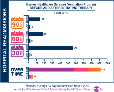An independent study found that modeling the Barnes Healthcare Services COPD management program could save 2.6 billion dollars of annual direct COPD healthcare expenditures in the United States. The study found our multifaceted intervention which involves initiation of nocturnal advanced PAP modality (AVAPS-AE), respiratory therapist-led respiratory care, medication reconciliation, appropriate oxygen therapy initiation, and patient education led to significant reduction in rehospitalization.